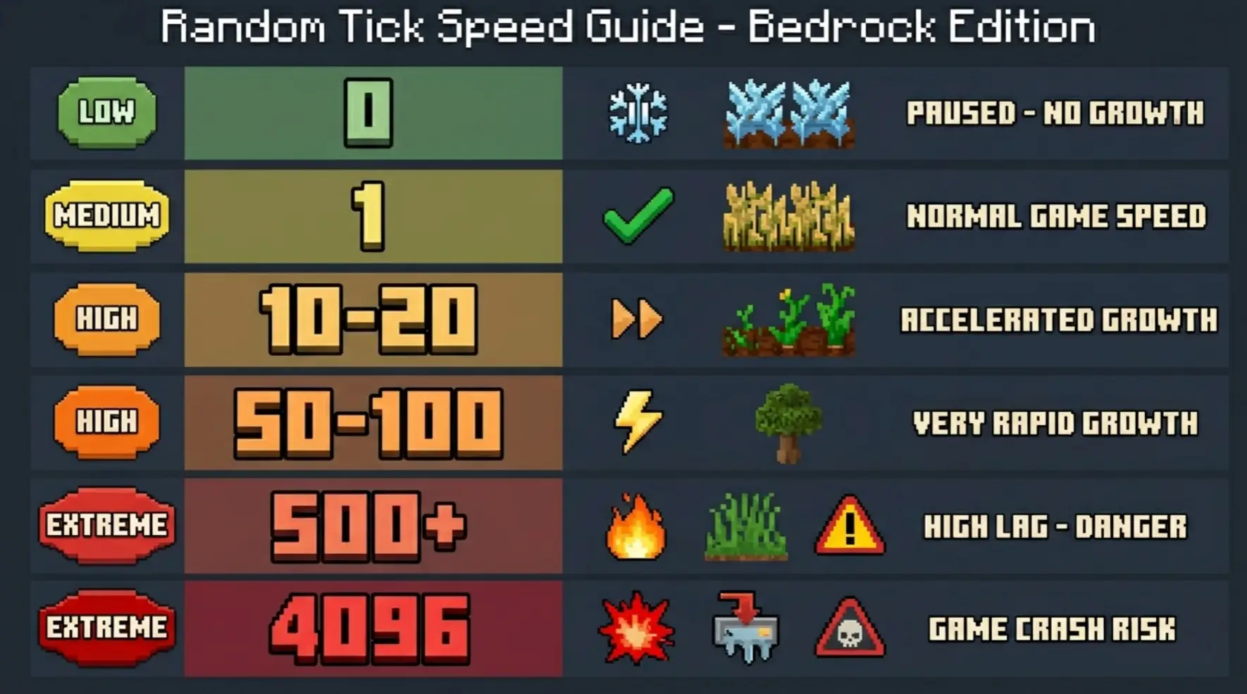 /gamerule randomtickspeed 1— default Bedrock speed/gamerule randomtickspeed 10— 10× faster than normal, good for growing crops quickly/gamerule randomtickspeed 100— very fast, useful for testing farm designs/gamerule randomtickspeed 0— nothing grows, nothing spreads, nothing decays