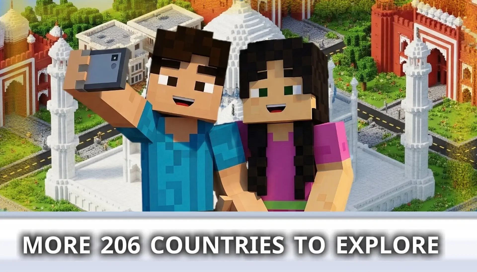Explore an Earth-scale Minecraft map featuring different countries, flags, cities, towns, villages, markets, items, and more. Compatible with the latest Minecraft versions and modern devices (PC, mobile, and other operating systems).