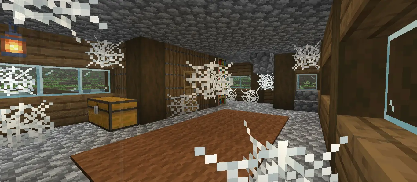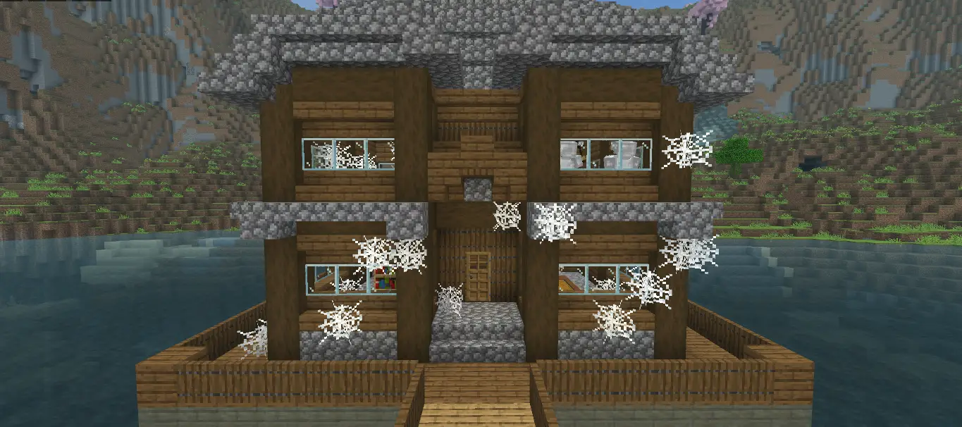 This is a charming spruce house built on a small island in a mountain lake. Before you can fully use the house you'll need to clean the cobwebs inside and outside. A chest at spawn contains Shears and Scaffolding to help you get started.