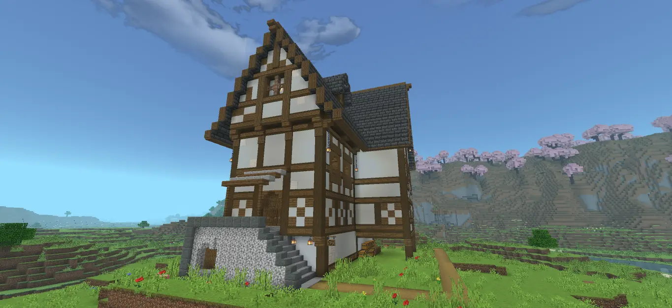 Explore a detailed three-story Medieval Mansion map for Minecraft with a nearby village, cherry blossom trees, and a surrounding river — perfect for survival or creative builds.