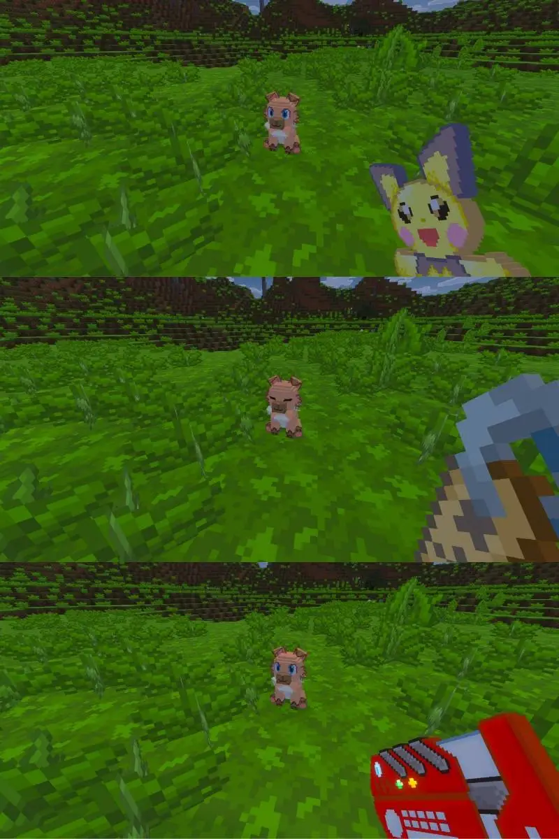 1. Pixel creature in grassy blocky field 2. Item held toward pixel creature 3. Red device used near pixel creature