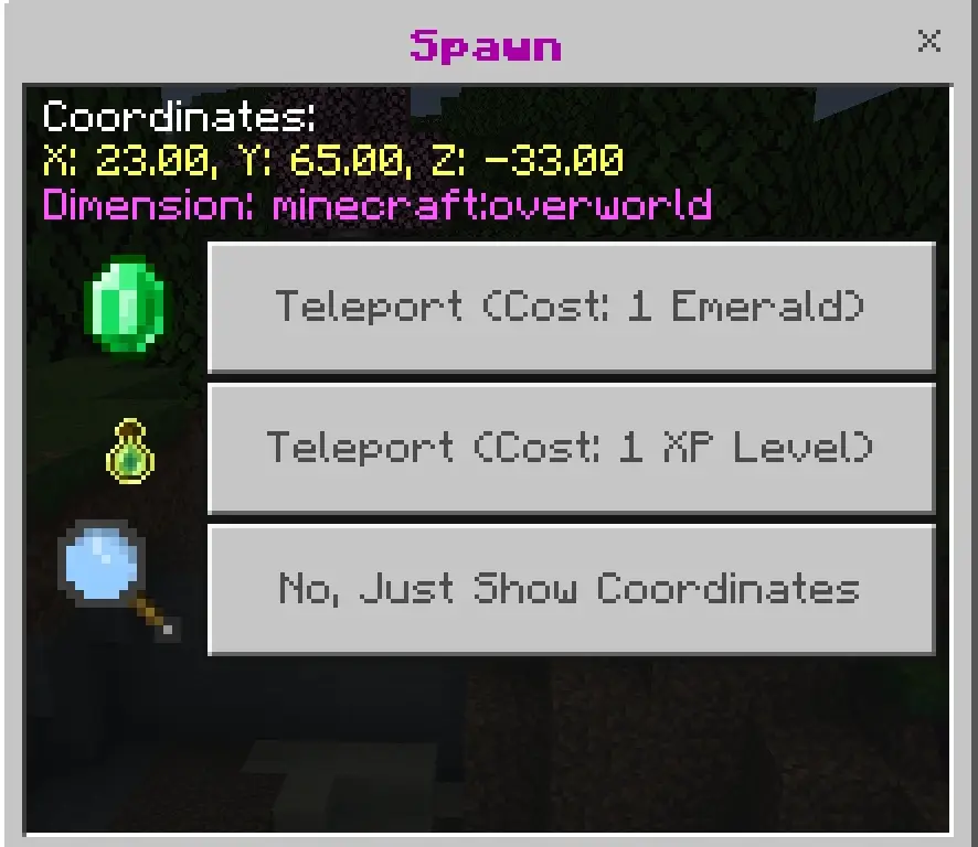 - Teleport can now use 1 XP level or 1 emerald to teleport.