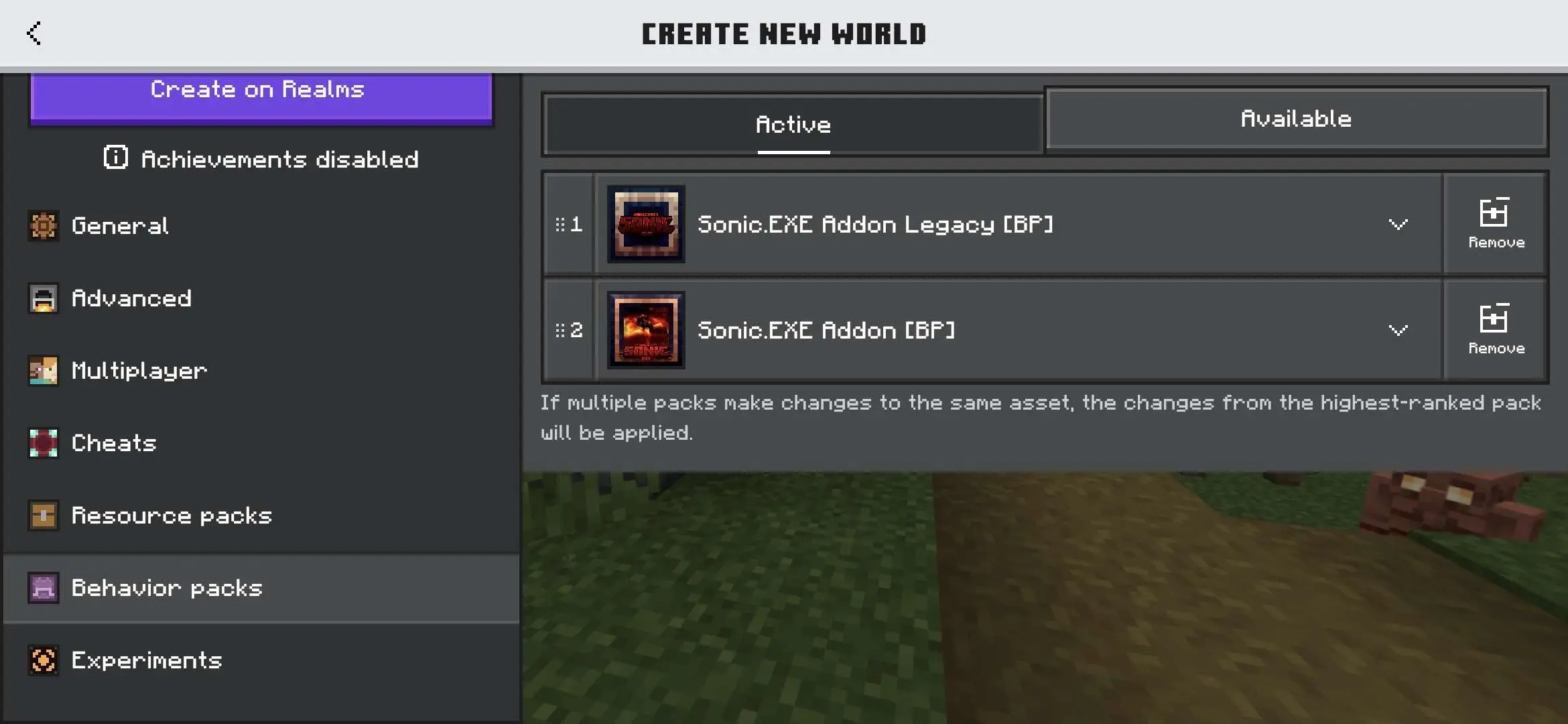 If you trying to activate Both Addon versions you must activate Sonic.EXE Addon Remake and eventually Legacy one in behavior packs, otherwise it won’t work anyway.