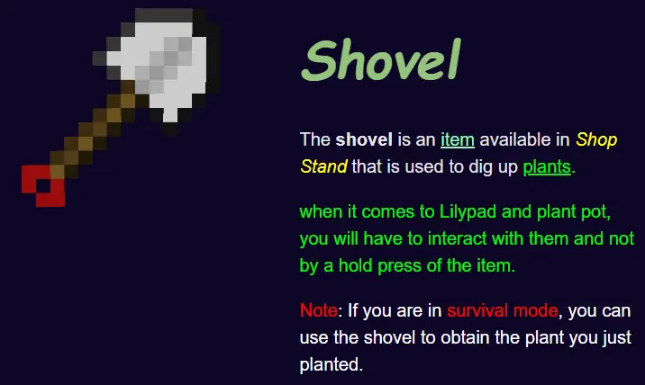 - Added a feature to obtain your plant back in survival mode when using the shovel item.