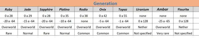 - Each ore spawns in specific biomes or dimensions (Overworld, Nether, End).