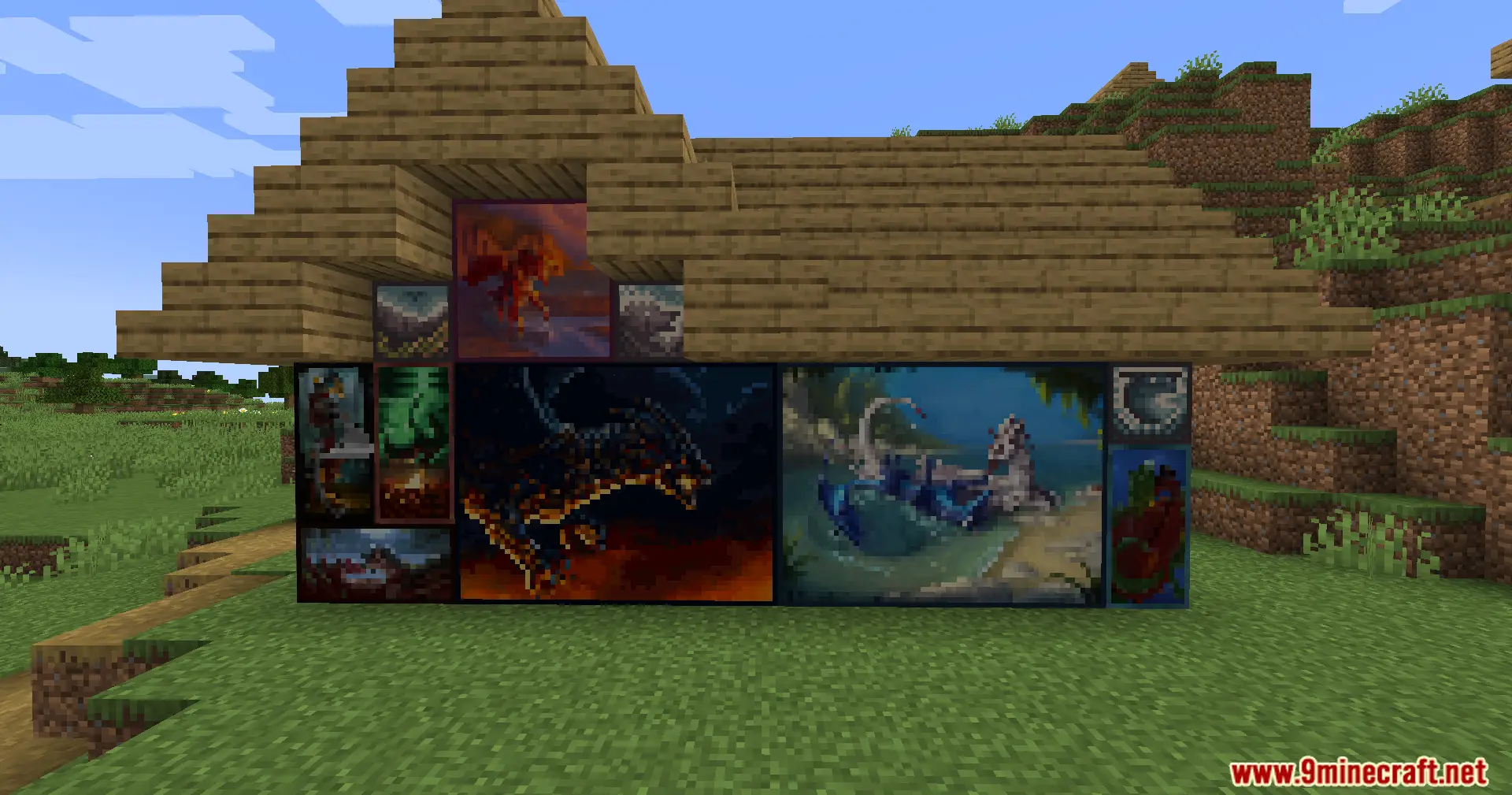 Adds over 30 pixel-art dragon paintings to Minecraft's painting selection; they appear randomly when placing a painting and come in sizes from 1×2 up to 8×4.