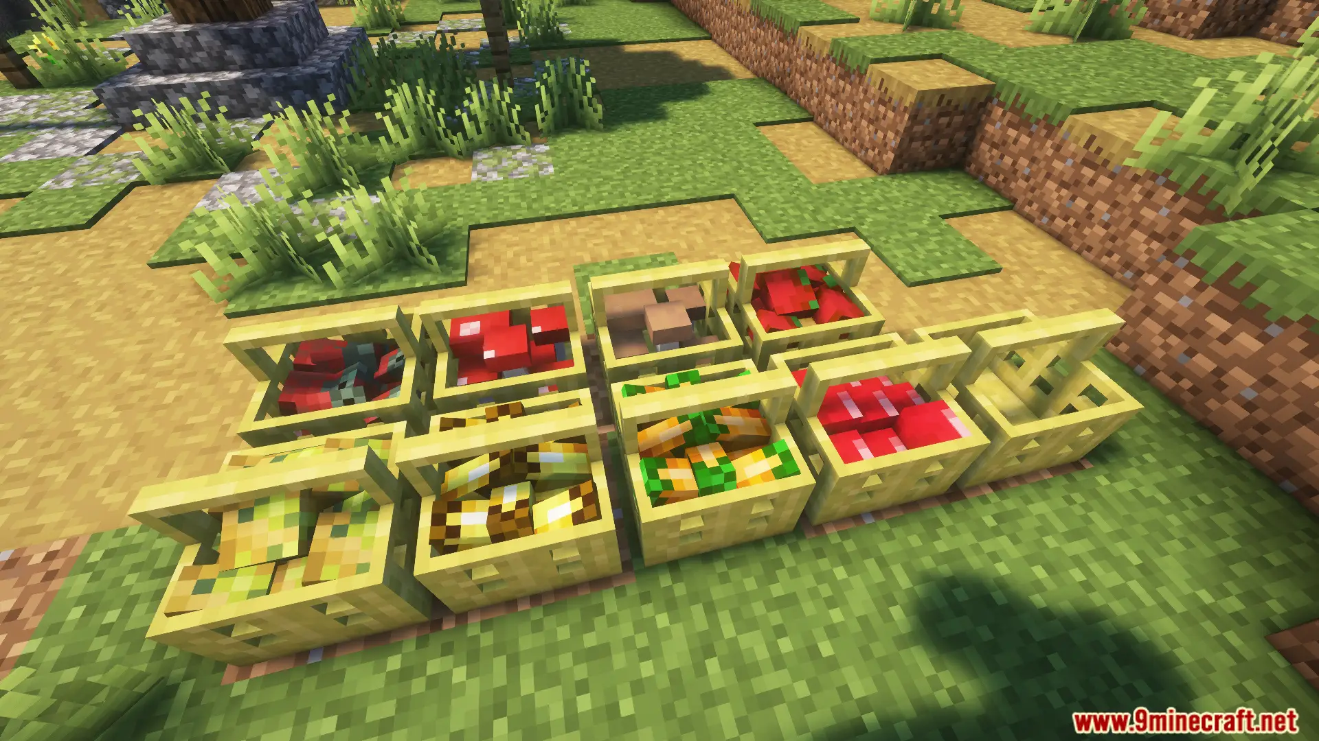 - Includes multiple types of barrels, baskets, and trays for storing items like plants, blocks, and other resources, tailored for organization.