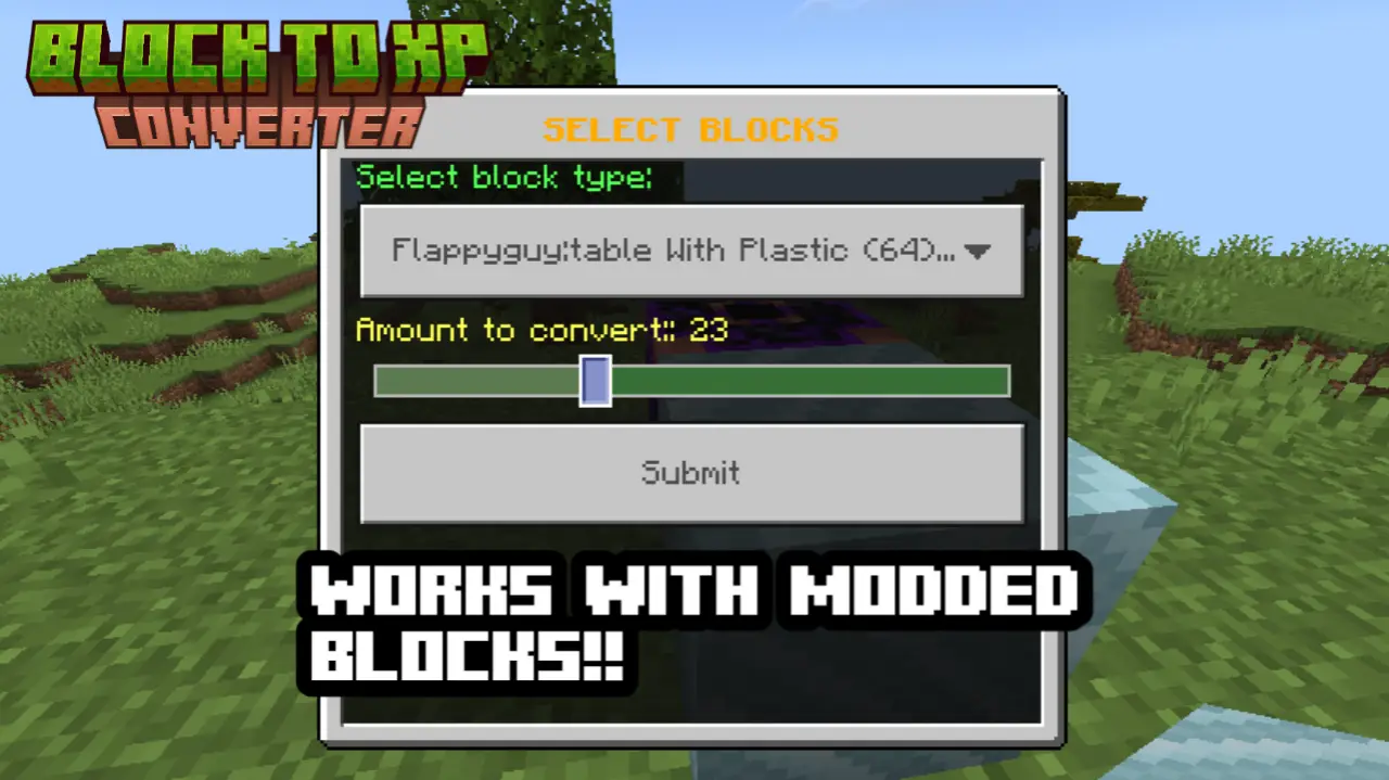 Convert blocks into experience with the Block To XP Converter: craft a special block that converts held blocks or your inventory into XP for quick leveling.