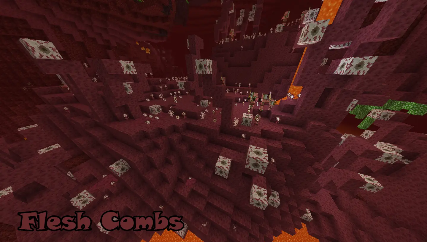 Flesh Combs: A biome composed of Living Flesh and Blood Lakes, a hostile biome primarily inhabited by Zombie Piglins and occasionally Zoglins!
