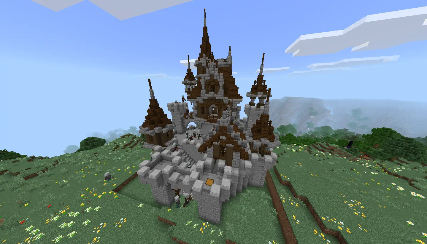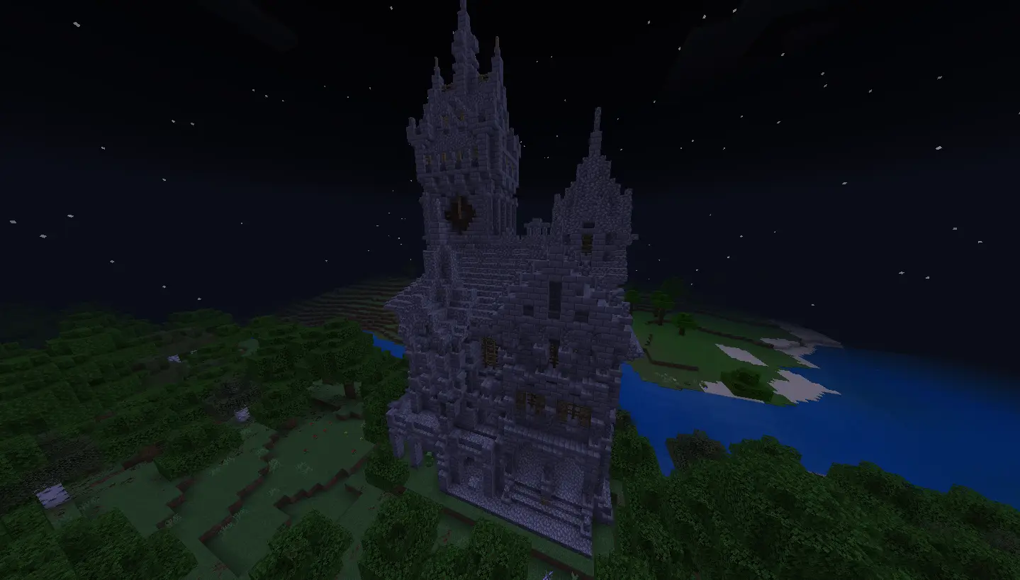 Sinister Illager castles and towers built from Stone Bricks, Cobblestone, and Dark Oak Planks/Logs.