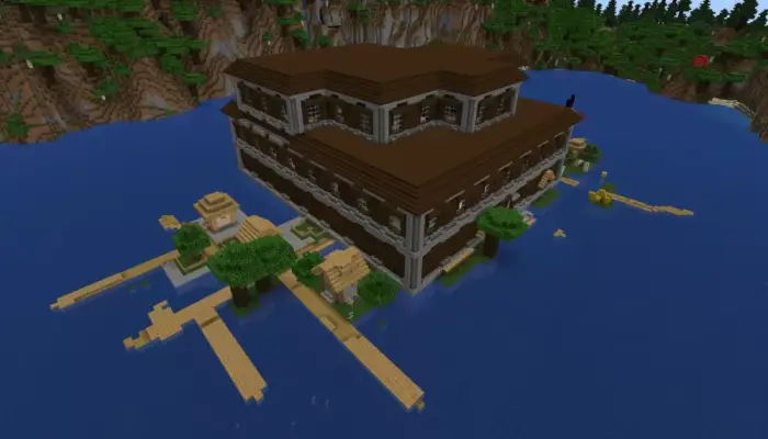 The real treasure is in the nearby serene lake, where a ruined Nether portal stands as a mysterious landmark. You can investigate the collapsed gateway and potentially find valuable loot around its ruins. But the most impressive feature lies beneath the mansion itself—an Ocean Monument hidden underwater in the depths below. Navigate its dark corridors, fight the guardians, and claim the treasures inside for a complete early-game advantage.