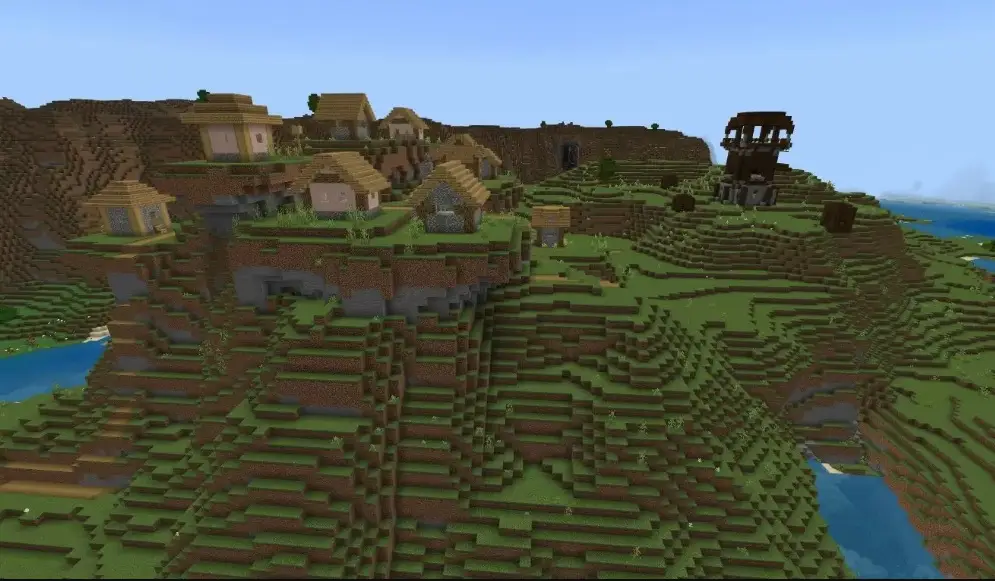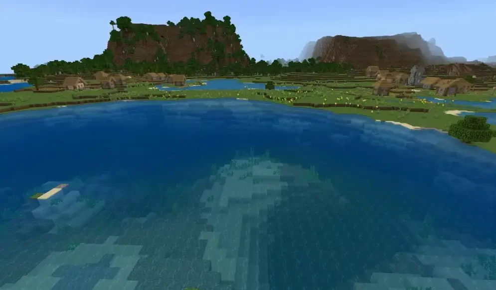 You spawn beside a lake with a small island in the center, surrounded by four villages within easy walking distance. That gives you immediate access to trading, beds, and basic supplies without needing to travel far. One of the villages sits close to a Pillager Outpost at around 230 ~ 180, so you can gear up from the villages and take on the raid challenge early.