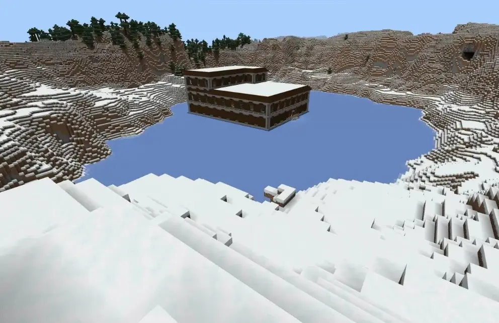 This seed spawns you on the shore of a large frozen lake in a snowy plains biome. A woodland mansion sits on the lake, and a village has partially generated into the mansion itself, merging the two structures together. A pillager outpost is also nearby, and the pillagers start attacking villagers and iron golems immediately, so there's action from the moment you load in.