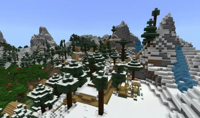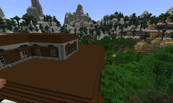 This seed places you in a mountainous area with a clear, elevated view right from the start. The spawn is located among hills surrounded by snow peaks, with a village built along the slopes nearby and a woodland mansion visible not far from it.