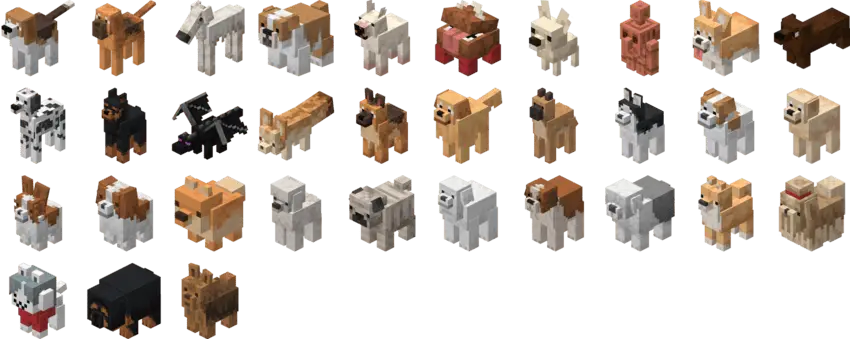 There are 40 new doggo textures (33 dog types) that can be obtained by using a specific nametag! This pack is a bedrock port for PixalThePixeled's Java Edition Texture Pack "The Doggos." More dog breeds will be added soon.
