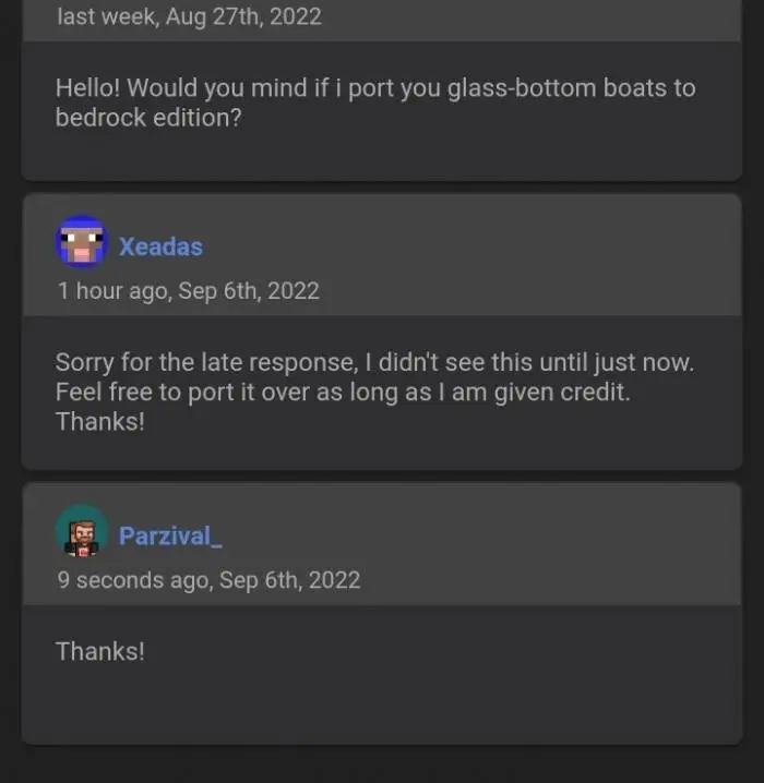 Hello, and welcome to another port of mine! "Glass-Bottom Boats" is a Java Pack originally made by Xeadas and was ported by me to Bedrock Edition. It does look a bit weird due to the water not being visible below the surface, but it looks kind of cool. All boats and chest boats are included! (including the new pale wood).