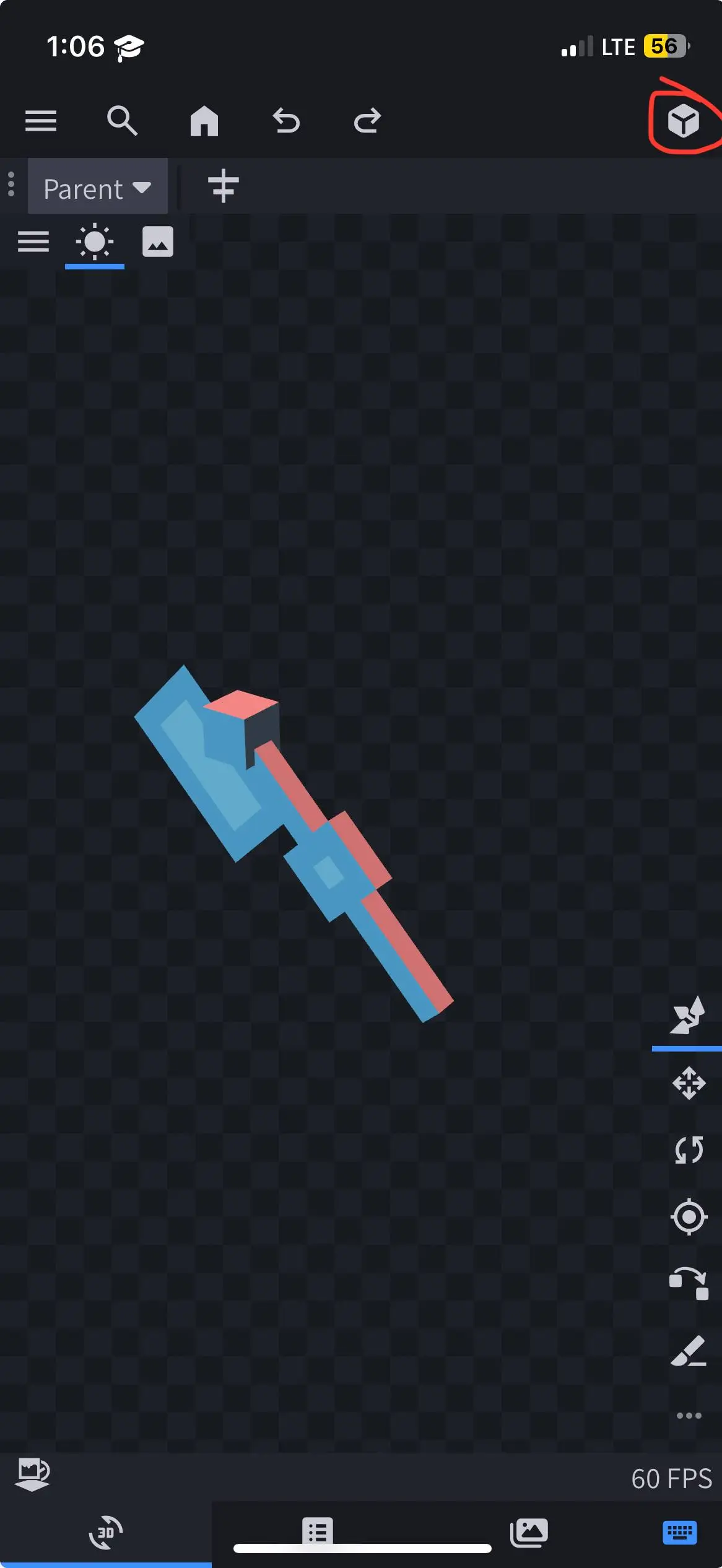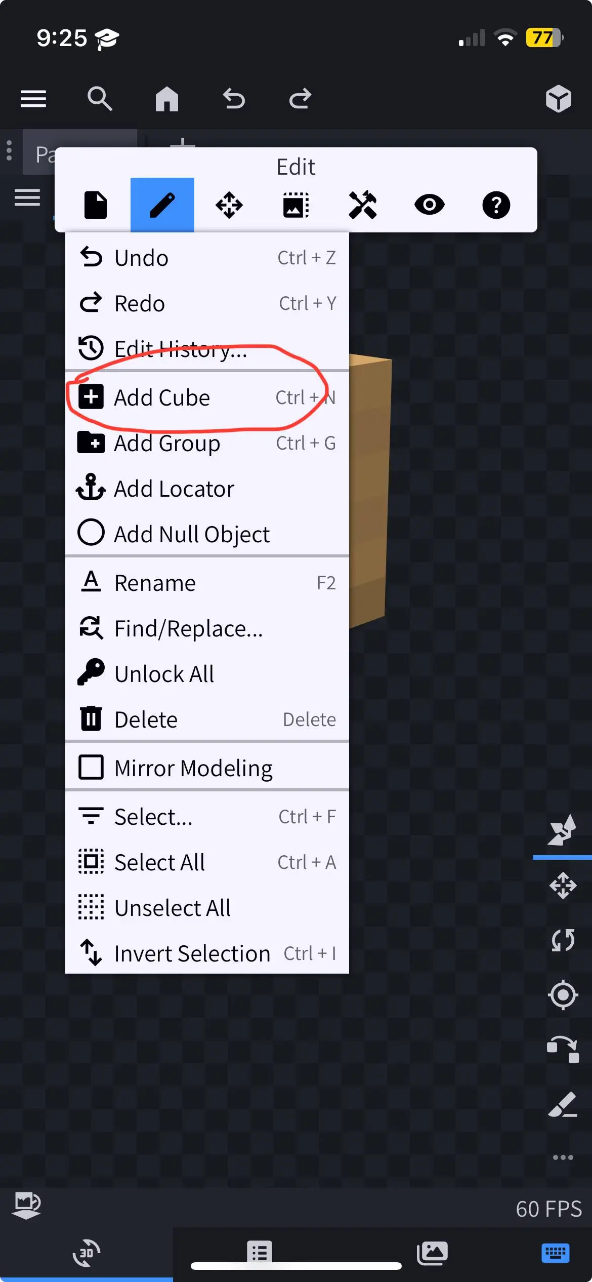 - To add a cube: Press the three-lines menu > Edit > Add Cube.