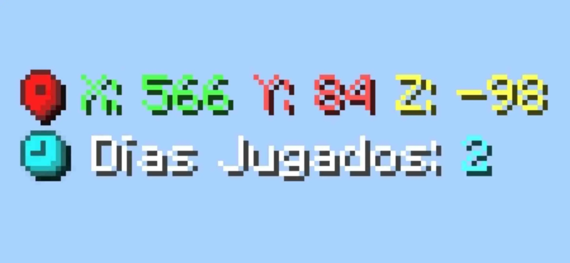 This texture pack adds three custom coordinate colors and an icon for coordinates to improve visibility while mining and navigating. The pack also adds a clock icon to the Days played counter and applies a custom color to the days number.