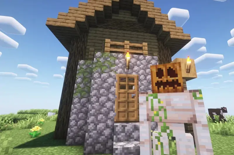 Bedrock resource pack that replaces Iron Golem heads with carved pumpkins, offering two versions and optional nametag controls for vanilla or pumpkin-headed golems.