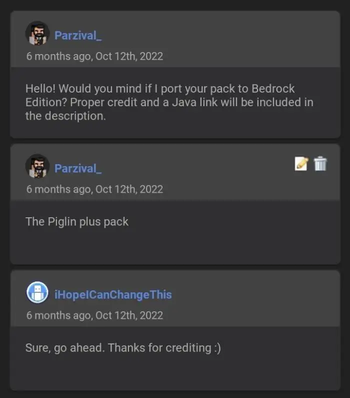 Hello, and welcome to another bedrock port of mine! This pack was originally made by iHopeICanChangeThis for Java Edition and was ported by me to Bedrock Edition. This pack adds varying skins for all types of piglin and hoglin